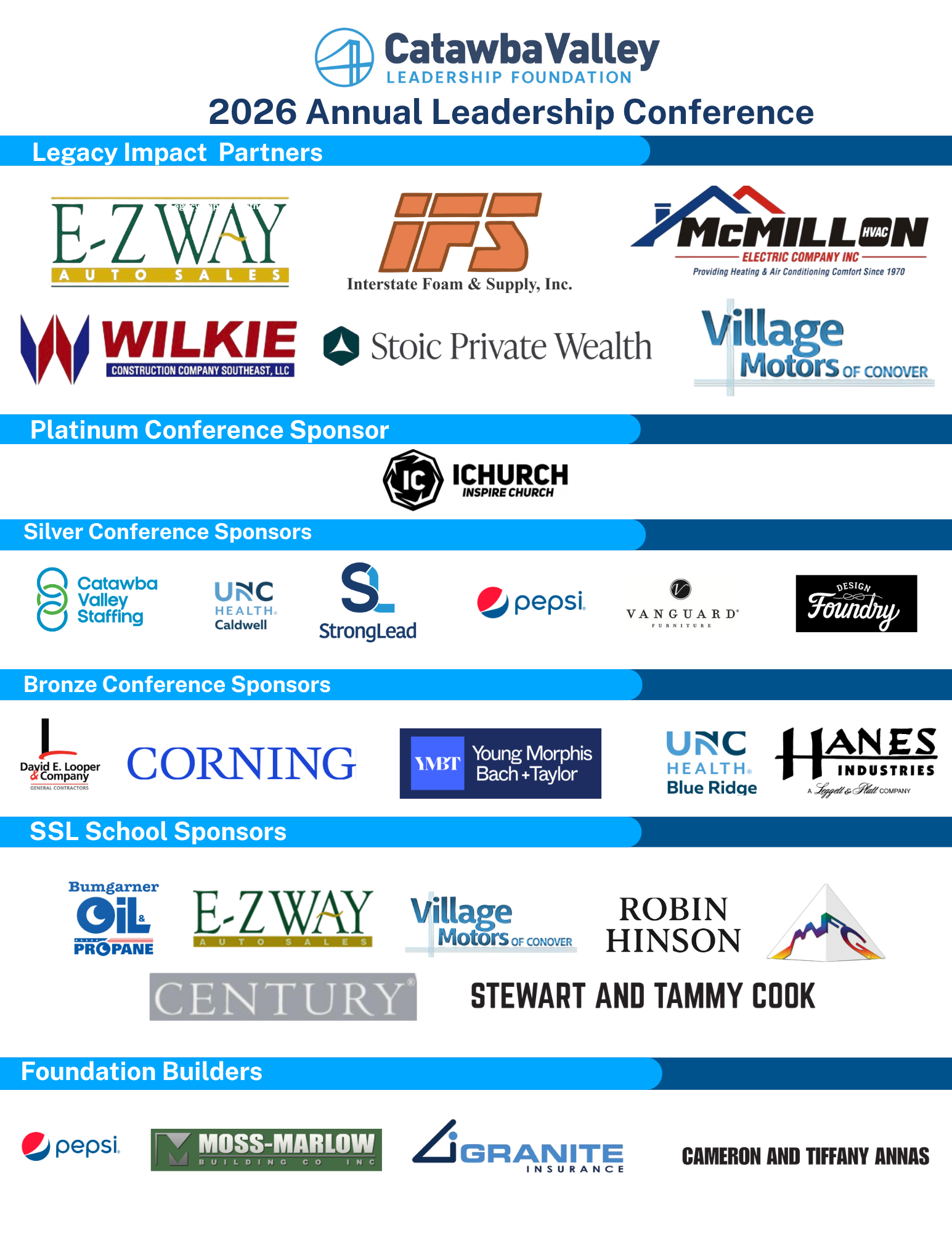 In 2026 we hosted an outstanding leadership conference where 600 leaders from the Catawba Valley gathered to gain wisdom on the topic of “All-In, The Legacy Starts Here”. We had the honor and privilege to have four phenomenal speakers from our community Bruce Schronce, Executive Partner and CEO of StrongLead and Founder of Catawba Valley Leadership Foundation; Lindsay Keisler, President/CEO of The Chamber of Catawba County; Carlos Rodriguez, Senior Pastor of IChurch and Chase Keller, President of Granite Insurance. The Foundation also awarded Keith Nichols, Vice President of Manufacturing at Century Furniture, The Leadership Impact Award!